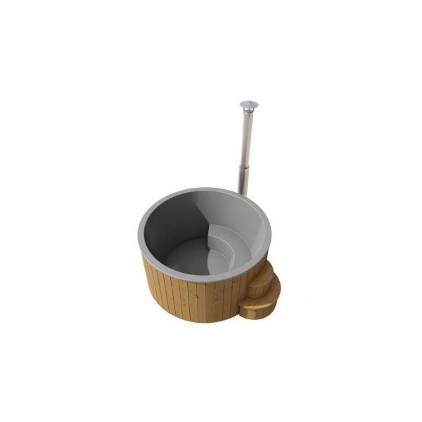 Polyester binnenbak antraciet, RVS houtkachel en kachelpijp, thermo cover, een trap, LED lampen en bubbel systeem